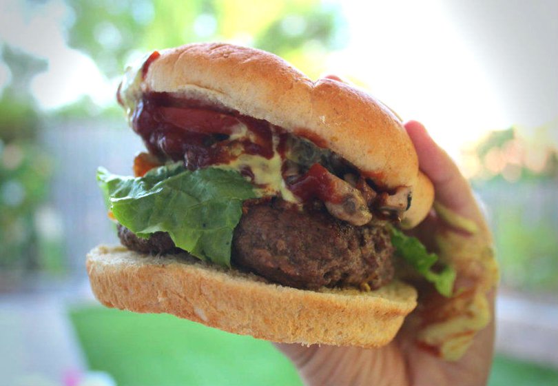 First, place the bottom burger bun on a serving plate. Then smear the mayo burger sauce over the top. Then place on 1-2 tomato slices. Then 2 halves of bacon. Then one of the cooked patties goes on top, and on top of the patty goes the additional 2 halves of bacon. On top of the bacon goes the sauteed mushrooms. Then on goes the piece of Romaine lettuce, and finally, on goes the last burger bun!